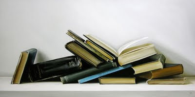 When I was working on the smaller piece with the Off to School book, I set up this. Or, rather, it set itself up. While trying to control the position of the books they sort of slid in to this arrangement. I thought the angles and lines pointing in different directions and overall horizontal composition worked well.